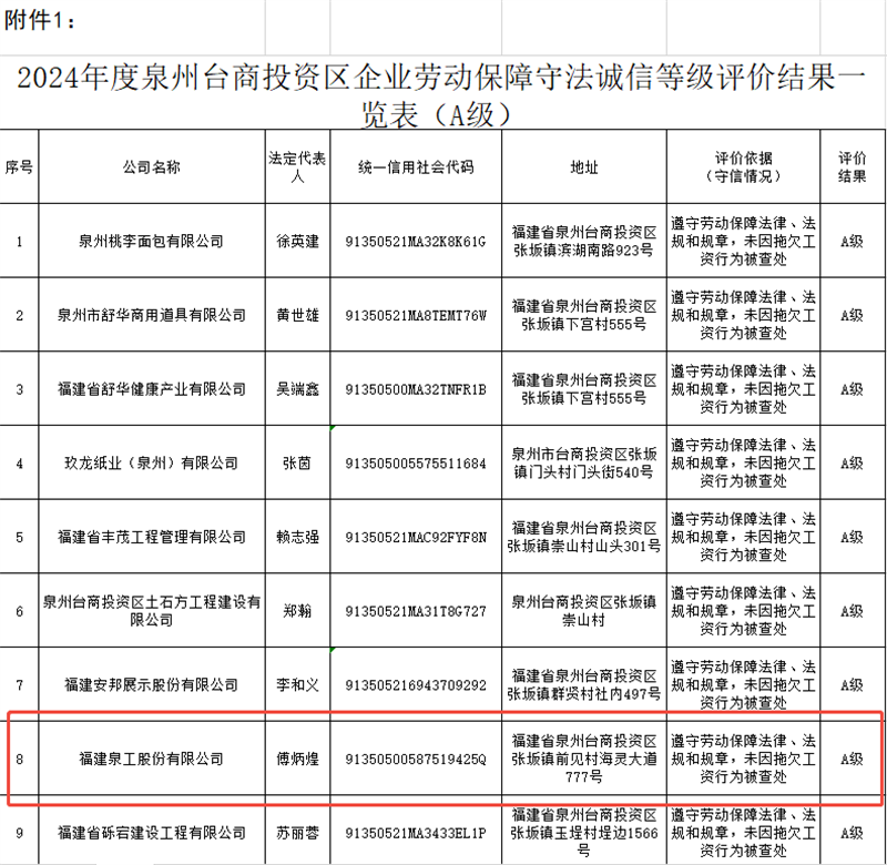 近日,根據(jù)《泉州臺商投資區(qū)管理委員會民生保障局關(guān)于開展2024年度企業(yè)勞動保障守法誠信等級評價的通知》(泉臺管民生文〔2025〕11號)文件規(guī)定,經(jīng)嚴格審核,福建泉工股份有限公司(以下簡稱“泉工股份”)被評定為“2024年度企業(yè)勞動保障守法誠信等級A級企業(yè)”,成為全區(qū)25家獲此殊榮的企業(yè)之一。