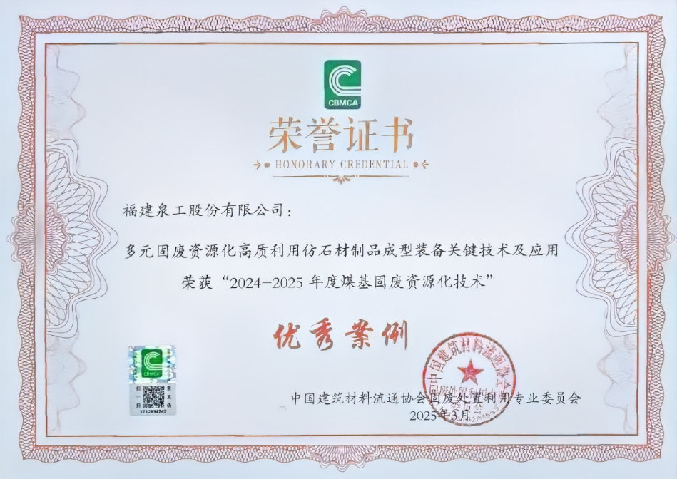 會議期間,泉工股份的“多元固廢資源化高質利用仿石材制品成型裝備關鍵技術及應用”案例成功榮獲2024-2025年度煤基/冶金固廢資源化技術優(yōu)秀案例。據(jù)悉,此次評選旨在表彰在固廢資源化利用領域具有創(chuàng)新性和示范性的技術與應用,推動行業(yè)規(guī)模化和高值化發(fā)展,培育發(fā)展固廢綜合利用新質生產(chǎn)力。